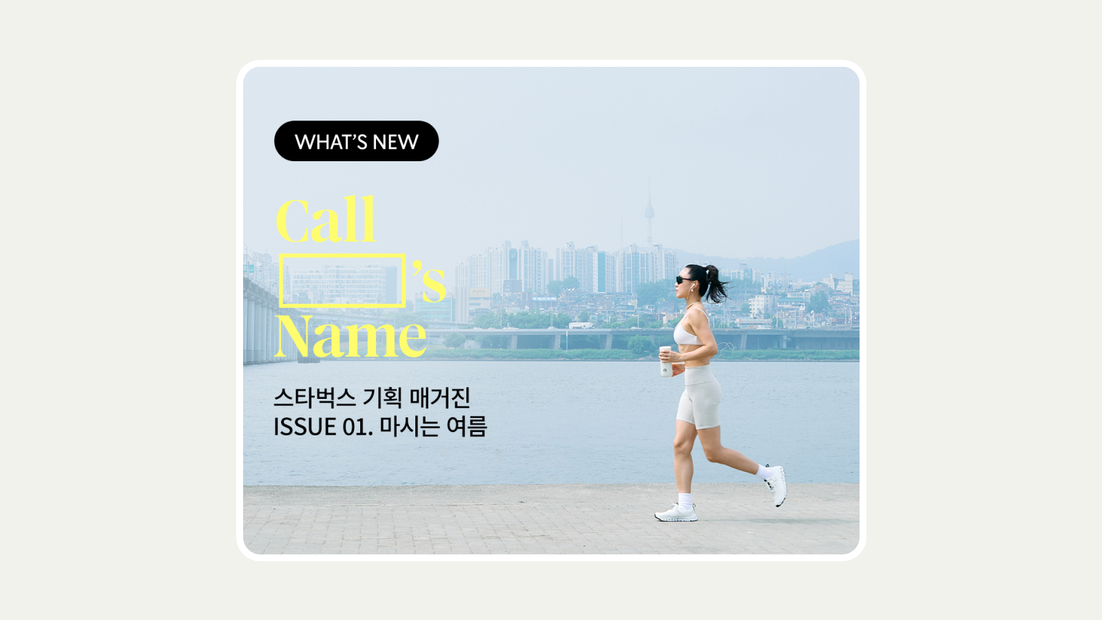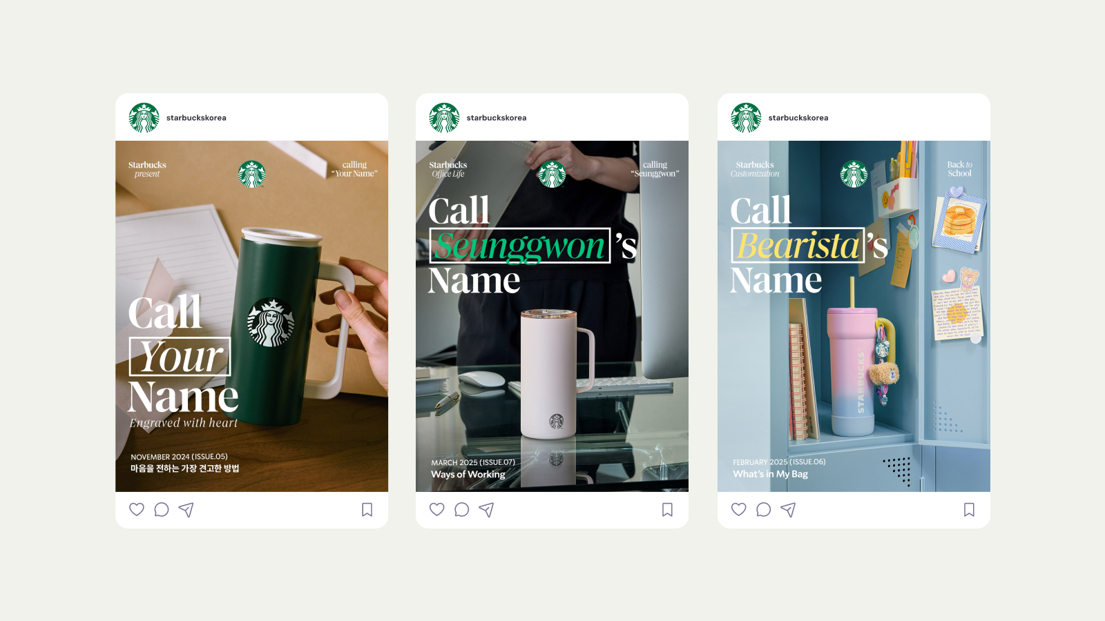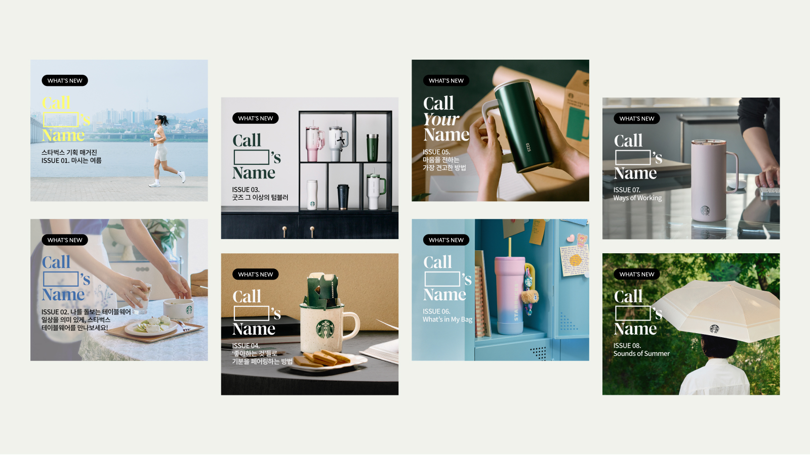 스타벅스 [Call __’s Name] 캠페인은 비주얼 아트 디렉터, 커뮤니티 전문가, 공간 디자이너, 카피라이터 등 스타벅스 없이 살아갈 수 없는 다양한 라이프스타일 캐릭터를 소개하며 고객들의 공감을 자극했습니다. 그들과 함께하는 스타벅스 상품에 대한 선망을 일으키며 MD상품 판매율 상승을 이끌었고 공식 앱 내 체류시간을 높이며 스타벅스 이커머스 영역을 오래 머물고 싶은 공간으로 안착시켰습니다.