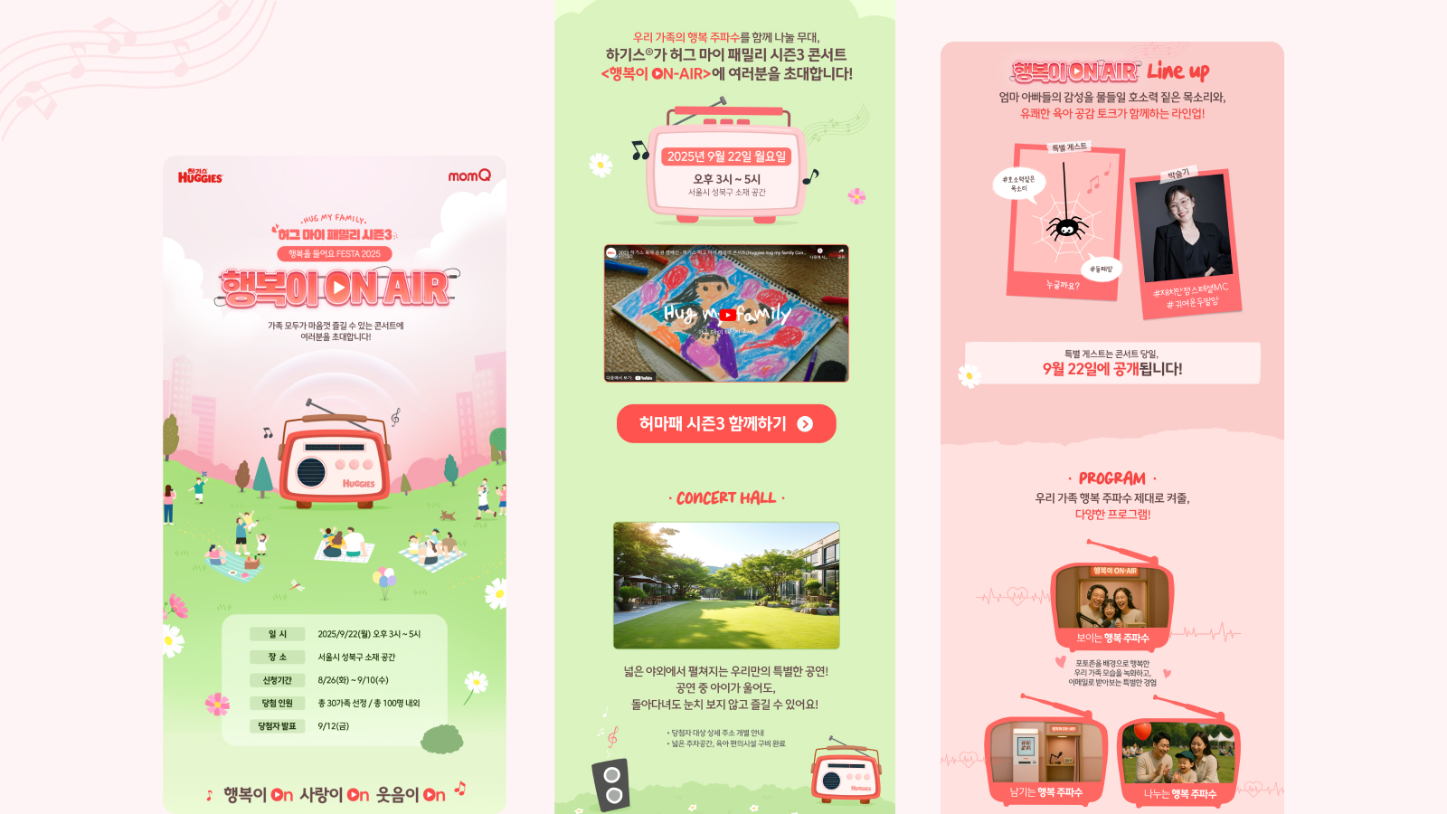 오프라인 행사인 2025년 ‘행복이 ON AIR 콘서트’는 가족 참여형 프로그램을 통해 육아 공감대를 형성하고, 일상을 담은 콘텐츠로 브랜드 메시지를 자연스럽게 전달했습니다. 또한 가족의 이야기를 기반으로 한 일러스트 영상 콘텐츠 제작 이벤트를 운영하며 SNS 참여를 유도했고, 다양한 에피소드형 콘텐츠를 확보했습니다.