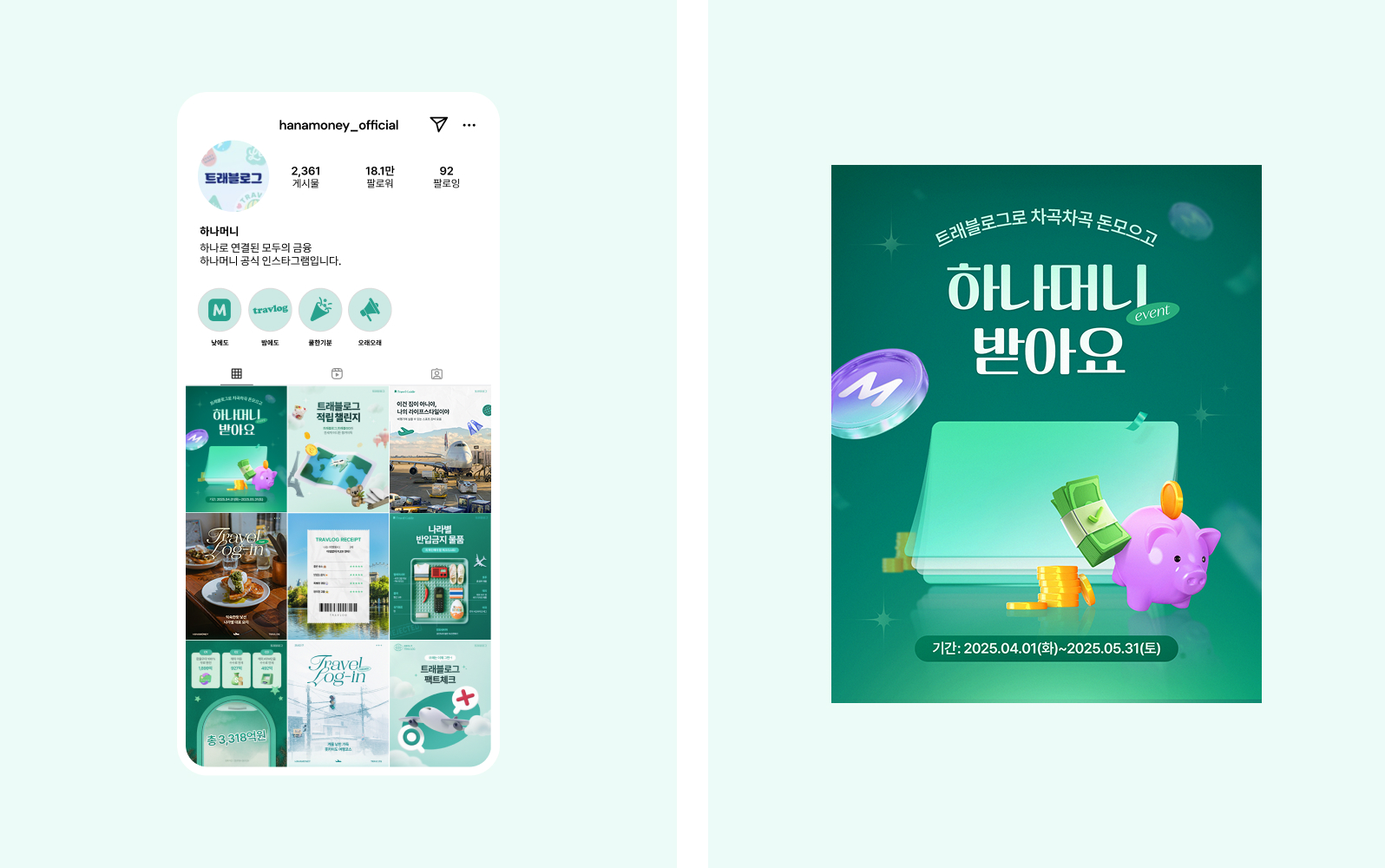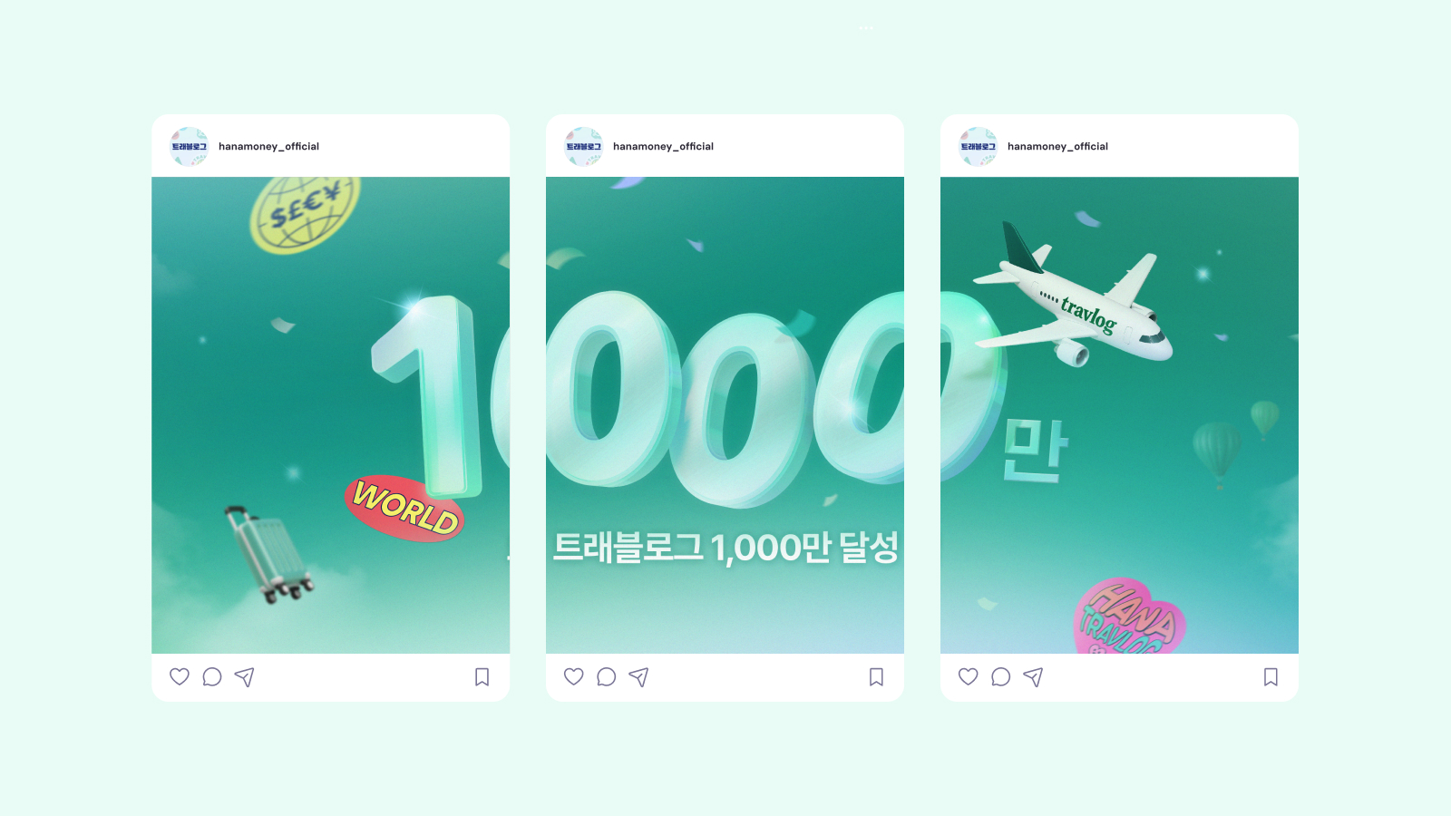 SNS 콘텐츠 운영 결과, 하나머니 <트래블로그> 인스타그램 채널은 조회와 반응 지표 전반에서 눈에 띄는 성장을 기록했으며, 이러한 채널 성장을 바탕으로 신규 가입자 유입이 확대되며 서비스 이용자 기반 확장에 기여했습니다.