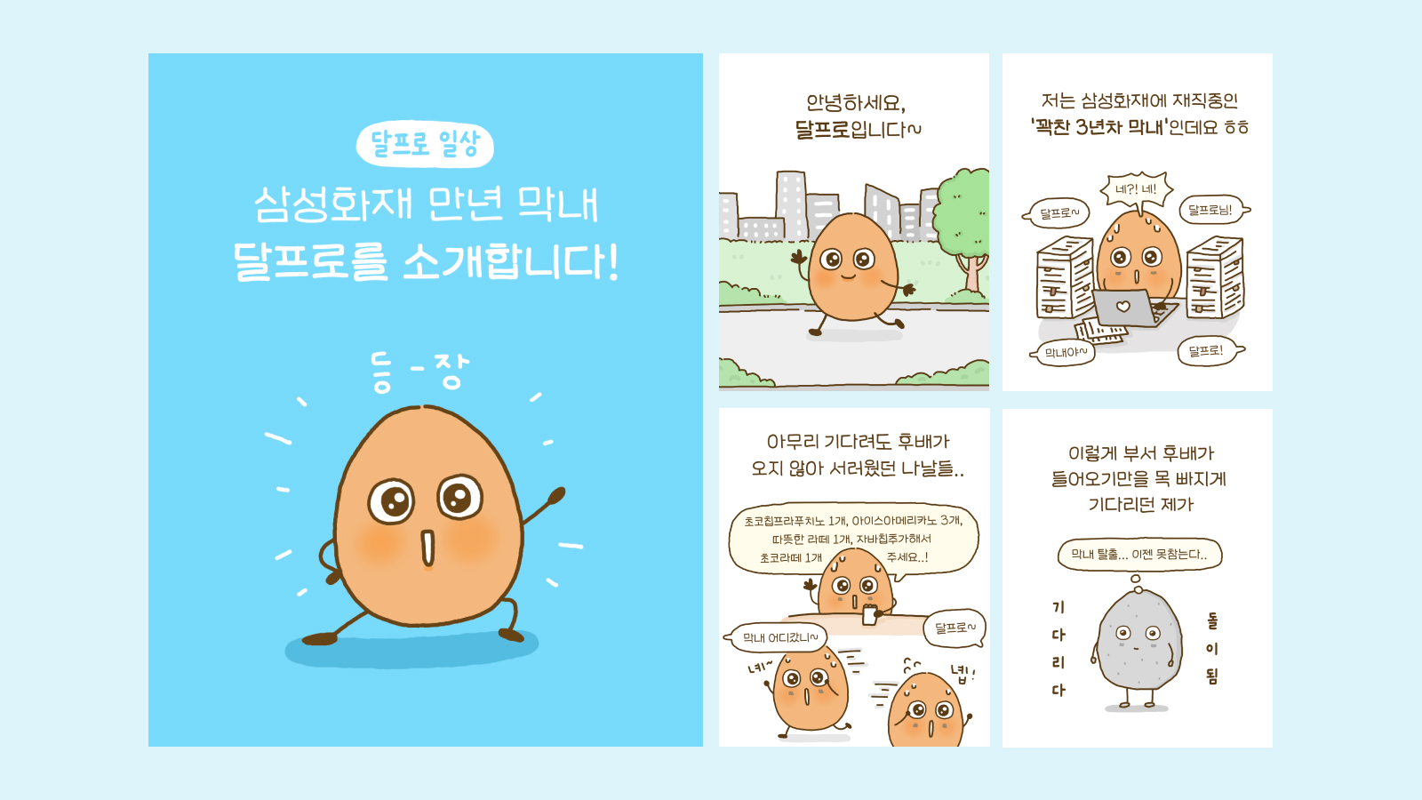 ‘달걀’에서 모티프를 얻은 보험회사 직장인 캐릭터 달프로를 통해, ‘달프로의 일상’과 ‘달프로의 이상’이라는 인스타툰 시리즈를 선보였습니다. 평범한 회사원의 고군분투와 성장 과정을 유쾌하게 풀어내며, 회사 생활 속에서도 부드러움을 잃지 않자는 메시지를 담았습니다. 일상의 단맛과 쓴맛에 공감할 수 있는 스토리 안에 삼성화재의 서비스와 정보를 자연스럽게 녹여냈습니다.
