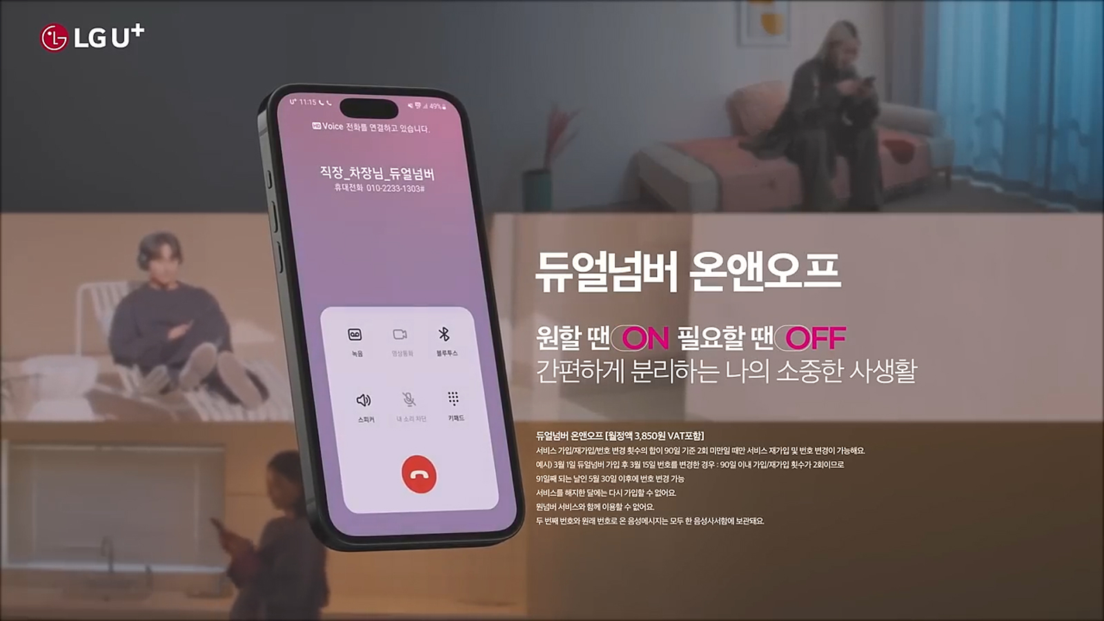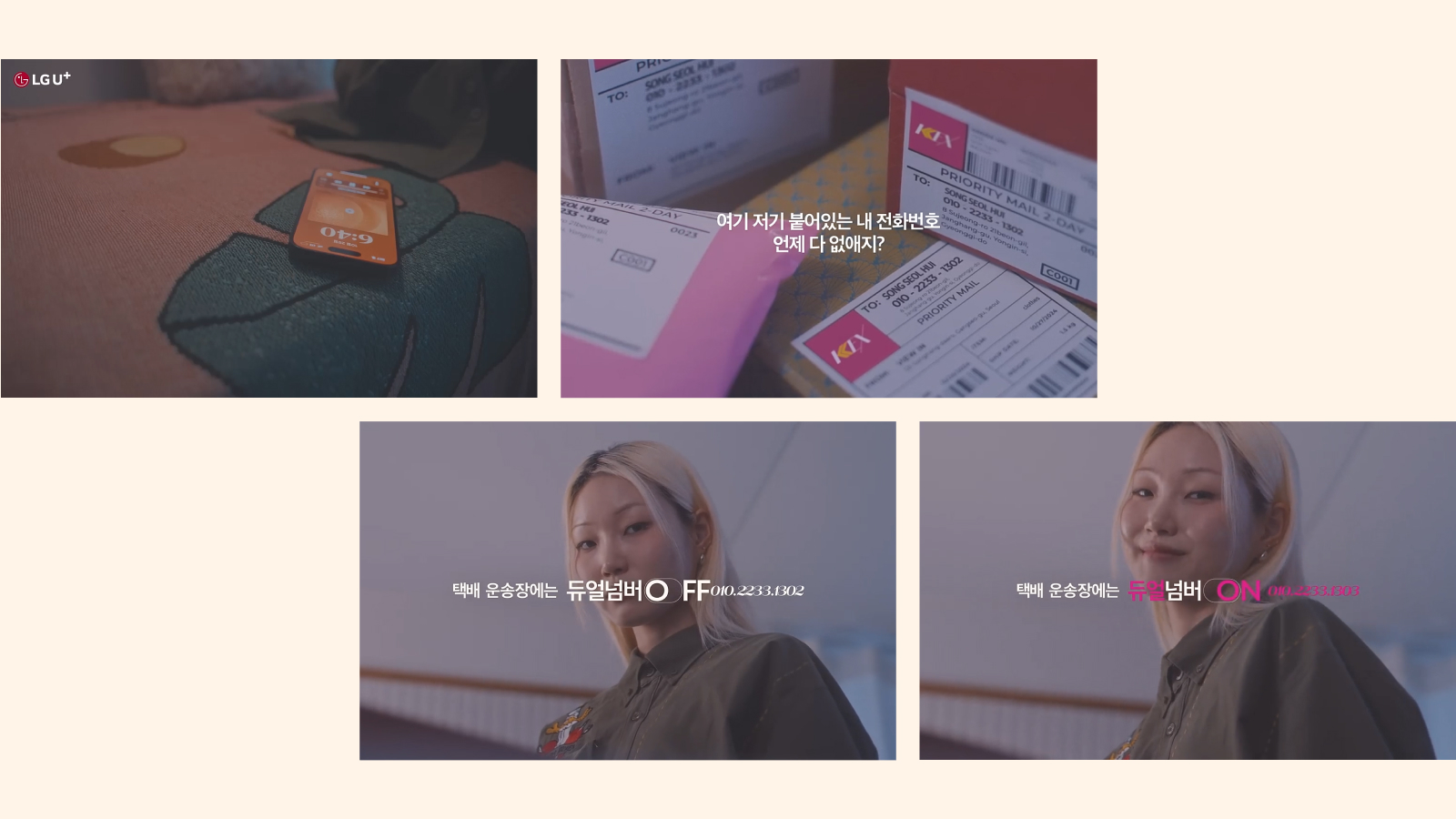 택배운송장의 개인정보를 걱정하는 송설희, 쉬고 싶은 주말, 상사의 업무연락을 받고 싶지 않은 남상원, 중고거래에서 상대방에게 전화번호 노출을 걱정하는 라은하를 통해 일상에서 비일비재한 듀얼넘버 온앤오프 서비스가 꼭 필요한 상황을 표현했습니다. ‘두 개의 번호로 일상을 새롭게’라는 카피로 새로운 서비스의 필요성을 심플하게 전달하고 ‘원할 땐 ON 필요할 땐 OFF 간편하게 분리하는 나의 소중한 사생활’이라는 엔딩 장면 카피로 네이밍과 서비스 핵심 속성을 한번 더 강조했습니다.