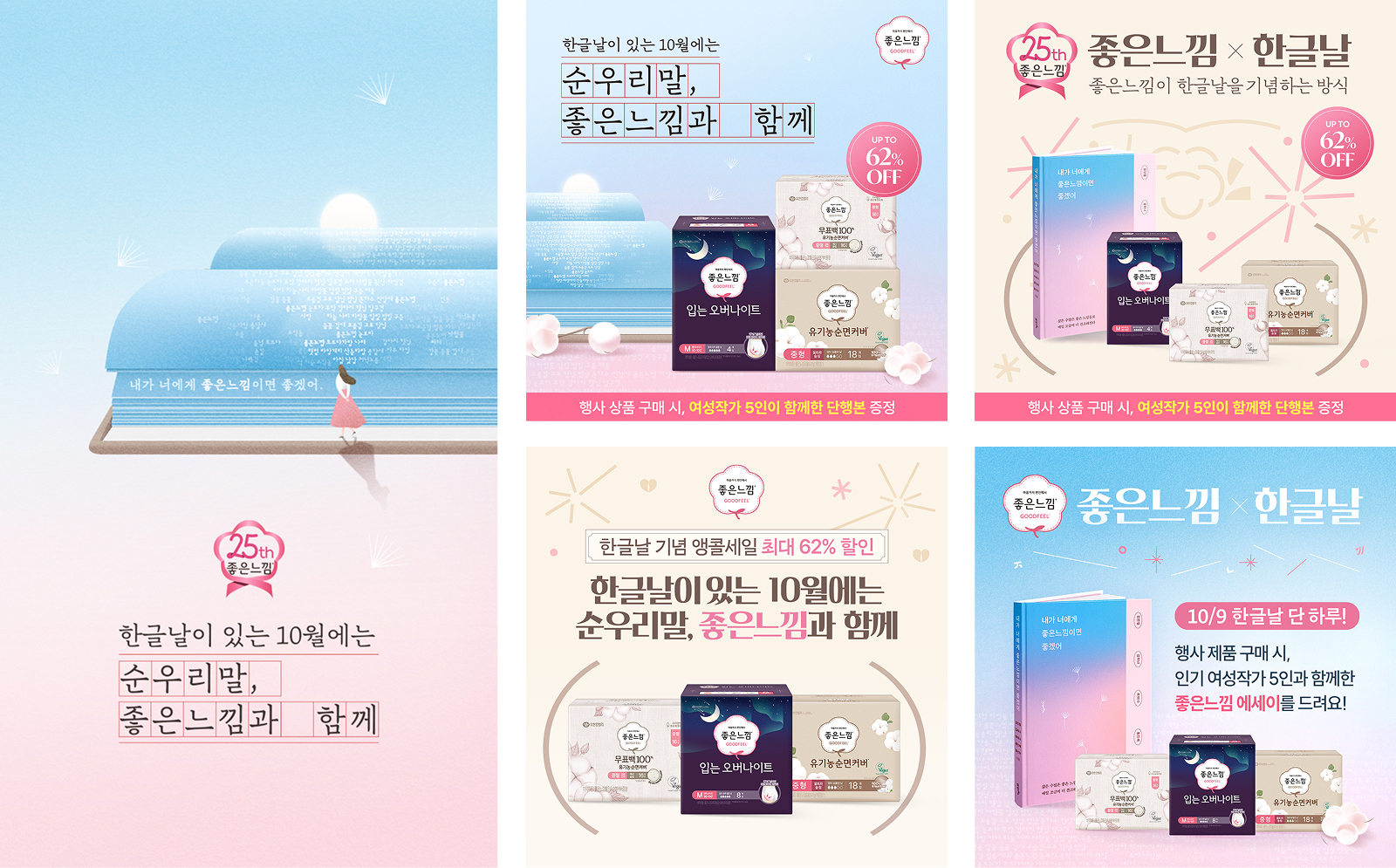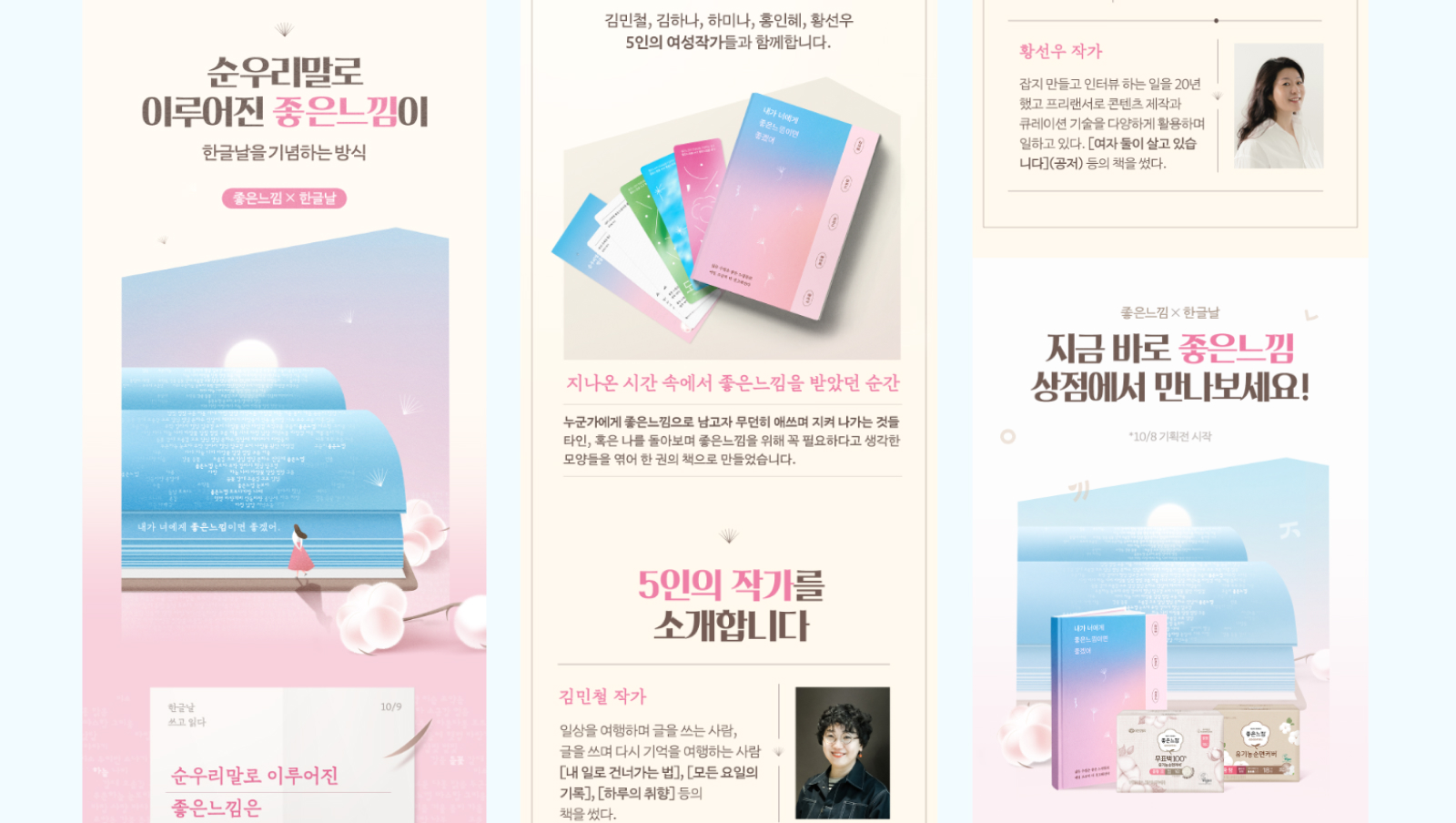 온더플래닛은 할인이나 제품 중심의 커뮤니케이션 대신, 좋은느낌이 한글과 언어의 가치에 얼마나 진심인 브랜드인지를 전하는 데 집중했습니다. 2030 여성에게 공감도가 높은 여성 작가 5인과 협업해, 각자의 시선으로 ‘좋은느낌’을 풀어낸 에세이집 〈내가 너에게 좋은 느낌이면 좋겠어〉를 출간했습니다. 개인적인 경험과 감정이 담긴 글을 통해, 한글로 기록된 여성들의 목소리를 한글날의 취지에 맞게 전달했습니다.