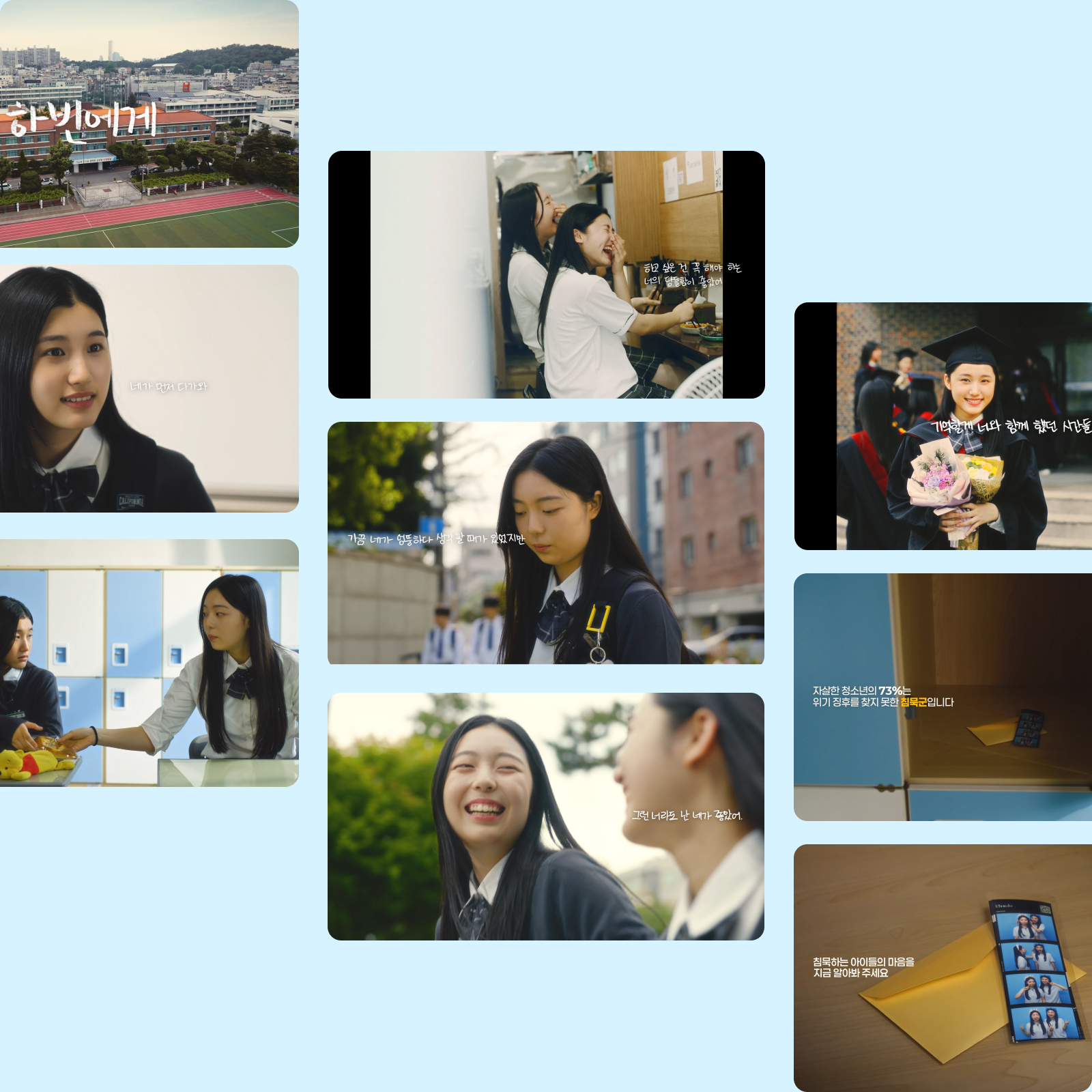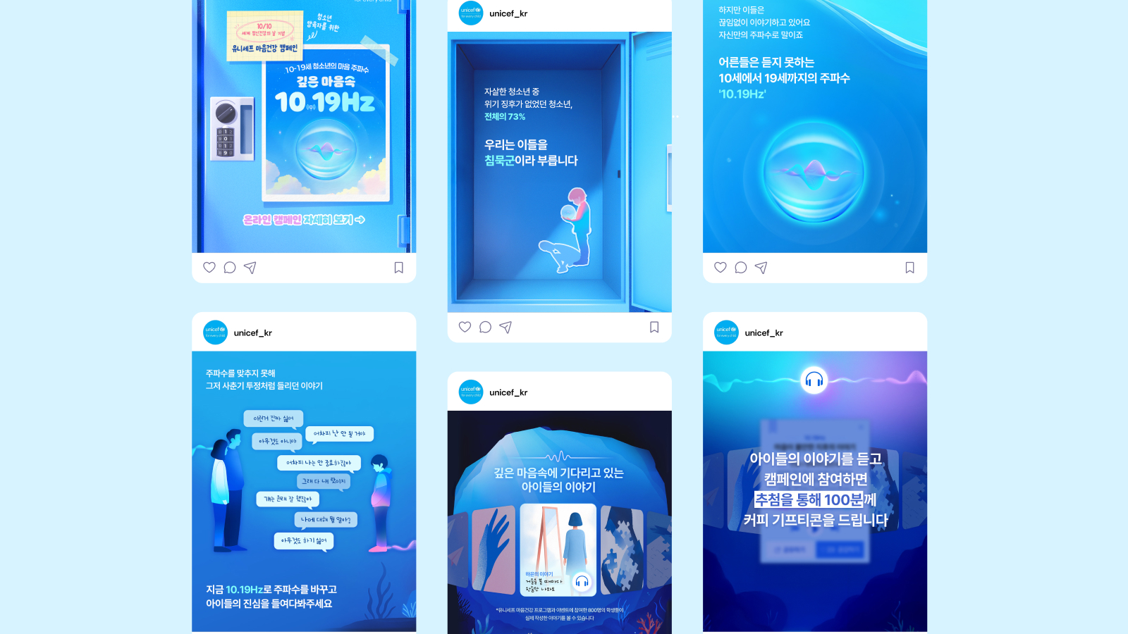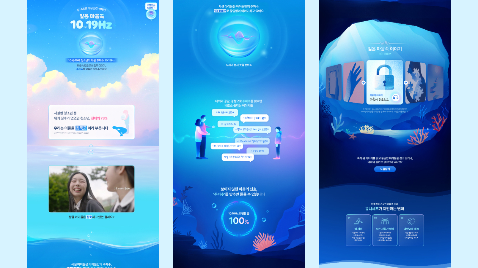 <깊은 마음속 10.19Hz> 캠페인은 학생들 800명의 실제 이야기가 바탕이 되었습니다. 온더플래닛은 캠페인의 독자적 슬로건과 키비주얼, 닫힌 물방울 속에서 요동치는 주파수를 형상화한 심벌 디자인을 개발하여 캠페인의 일관성을 구축했습니다. 하늘에서 심해로 이어지는 구성을 기획하고 아이들의 숨겨진 이야기를 심해로 표현한 웹페이지를 디자인 및 개발했고 청소년기를 상징하는 사물을 디자인 모티브로 하여 긴밀한 공감과 직관적 흥미를 유도했습니다.