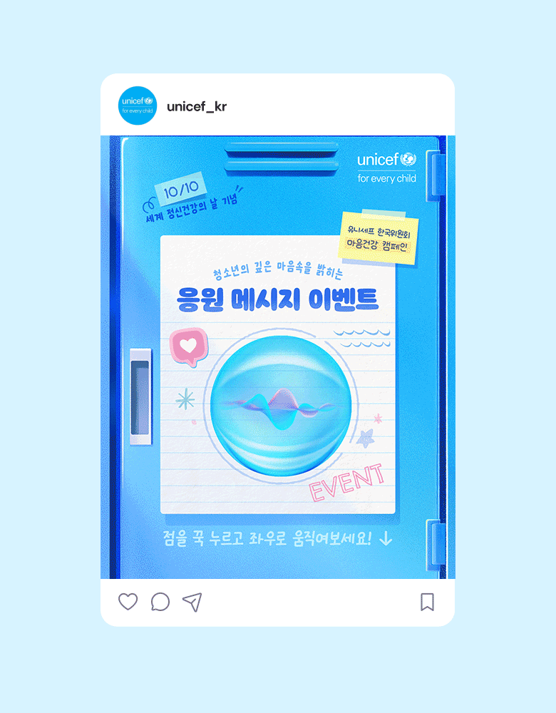 유니세프(UNICEF, 유엔아동기금)는 유엔 산하 기구로서 전 세계 어린이들을 위한 기금을 모금하고 보건, 영양, 식수·위생, 교육, 보호, 긴급 구호 등의 사업을 펼치고 있으며 한국에는 유니세프 한국위원회가 있습니다. 온더플래닛은 2025년 유니세프 마음건강 캠페인 <깊은 마음속 10.19Hz>을 총괄하며 청소년 마음속 깊은 곳의 진짜 이야기를 깊이 듣고 널리 나누었습니다.