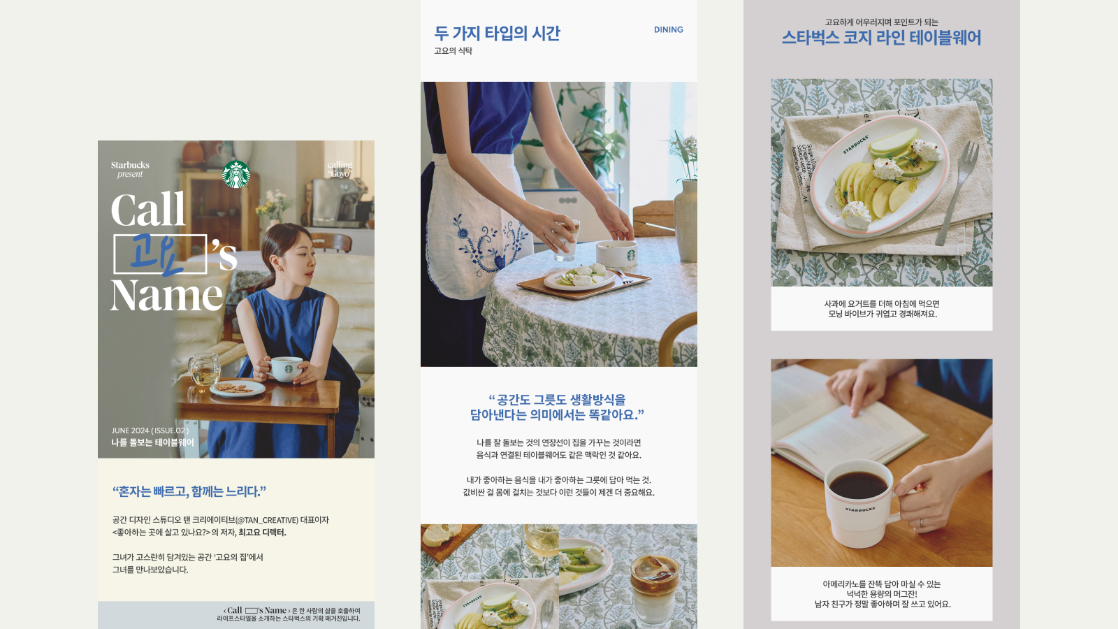 온더플래닛은 스타벅스에게 판매 중심적인 이커머스 페이지 내 매거진 [Call __’s Name]을 제안했습니다. 풍성한 브랜드 경험을 제공하며 커피가 나오면 이름을 불러주는 ‘콜 마이 네임’ 서비스처럼 누군가의 이름을 부르면 그의 삶이 호출된다는 콘셉트를 제안하고 브랜드 감도에 기반한 매거진 기획, 촬영, 디자인 전 과정을 수행했습니다. 한 사람의 라이프스타일을 스타벅스와 접목하여 소개하는 큐레이션 콘텐츠와 스타벅스 상세페이지까지 종합적으로 연결해 고객 친화적인 이커머스 D2C몰을 완성했습니다.