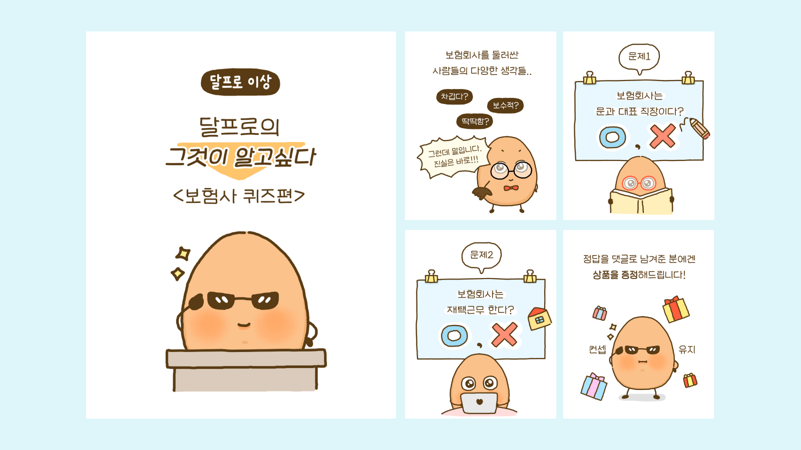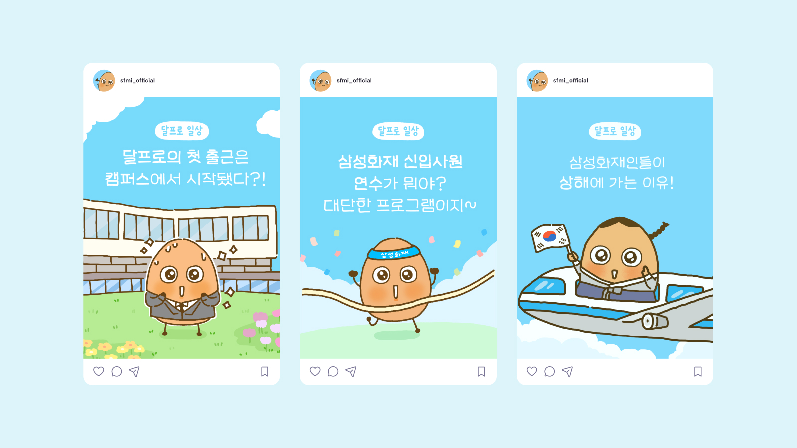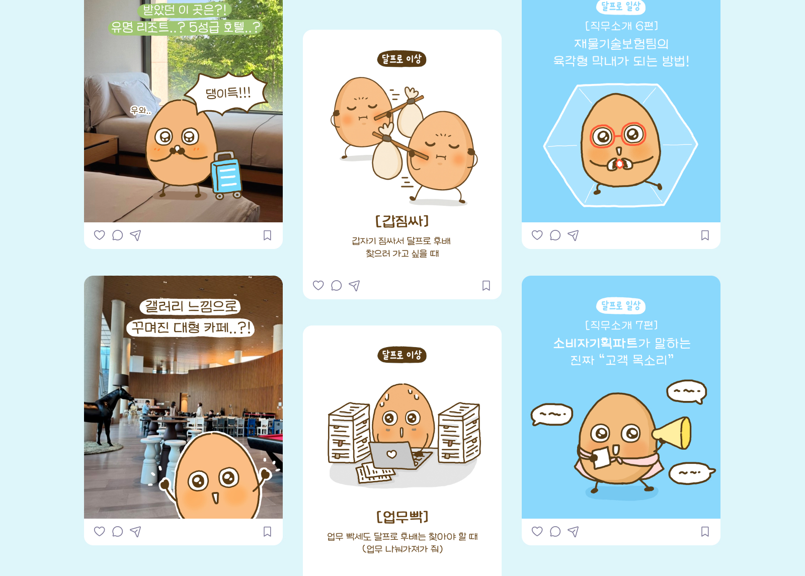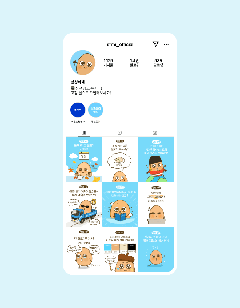 ‘달걀’에서 모티프를 얻은 보험회사 직장인 캐릭터 달프로를 통해, ‘달프로의 일상’과 ‘달프로의 이상’이라는 인스타툰 시리즈를 선보였습니다. 평범한 회사원의 고군분투와 성장 과정을 유쾌하게 풀어내며, 회사 생활 속에서도 부드러움을 잃지 않자는 메시지를 담았습니다. 일상의 단맛과 쓴맛에 공감할 수 있는 스토리 안에 삼성화재의 서비스와 정보를 자연스럽게 녹여냈습니다.
