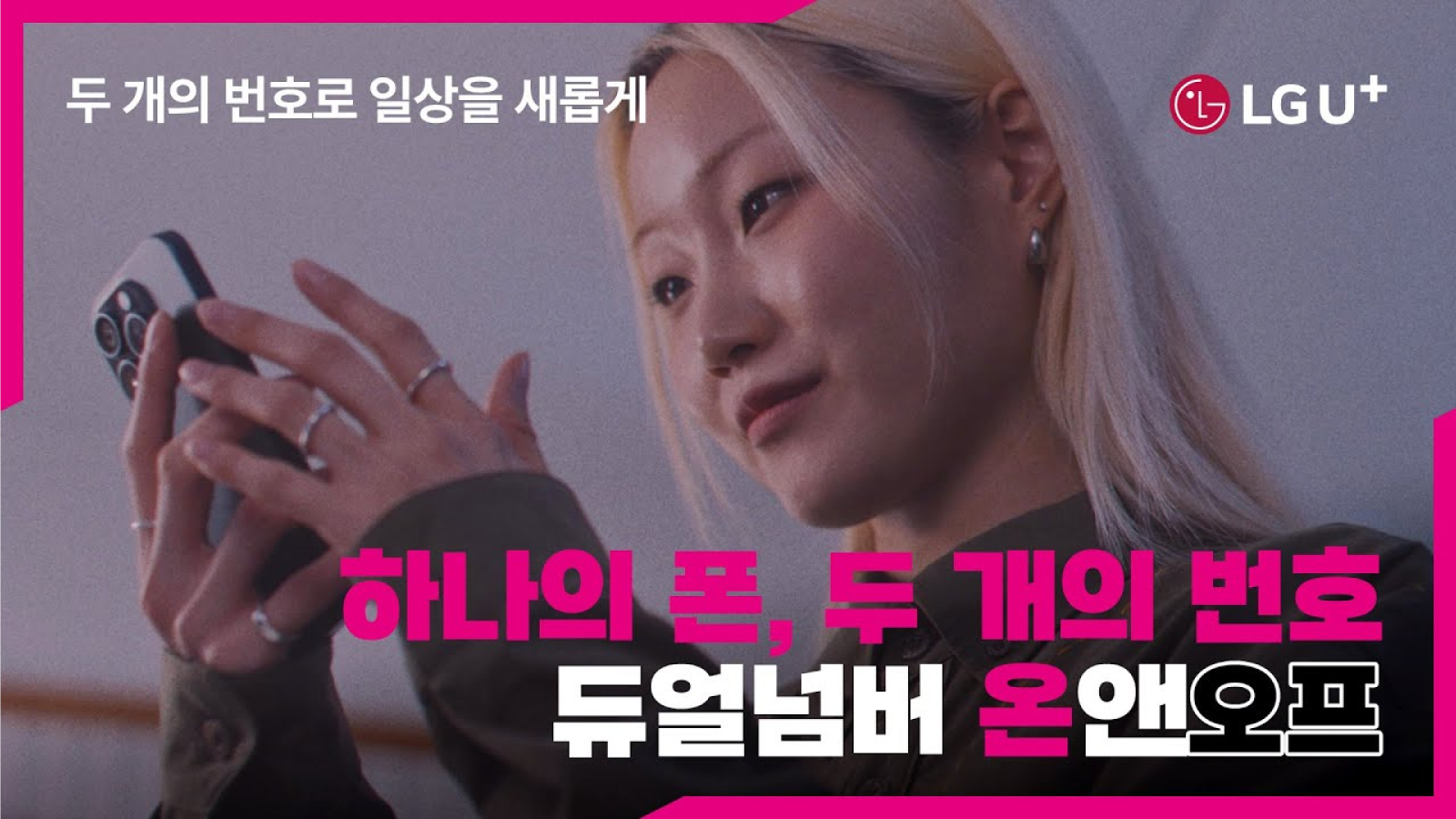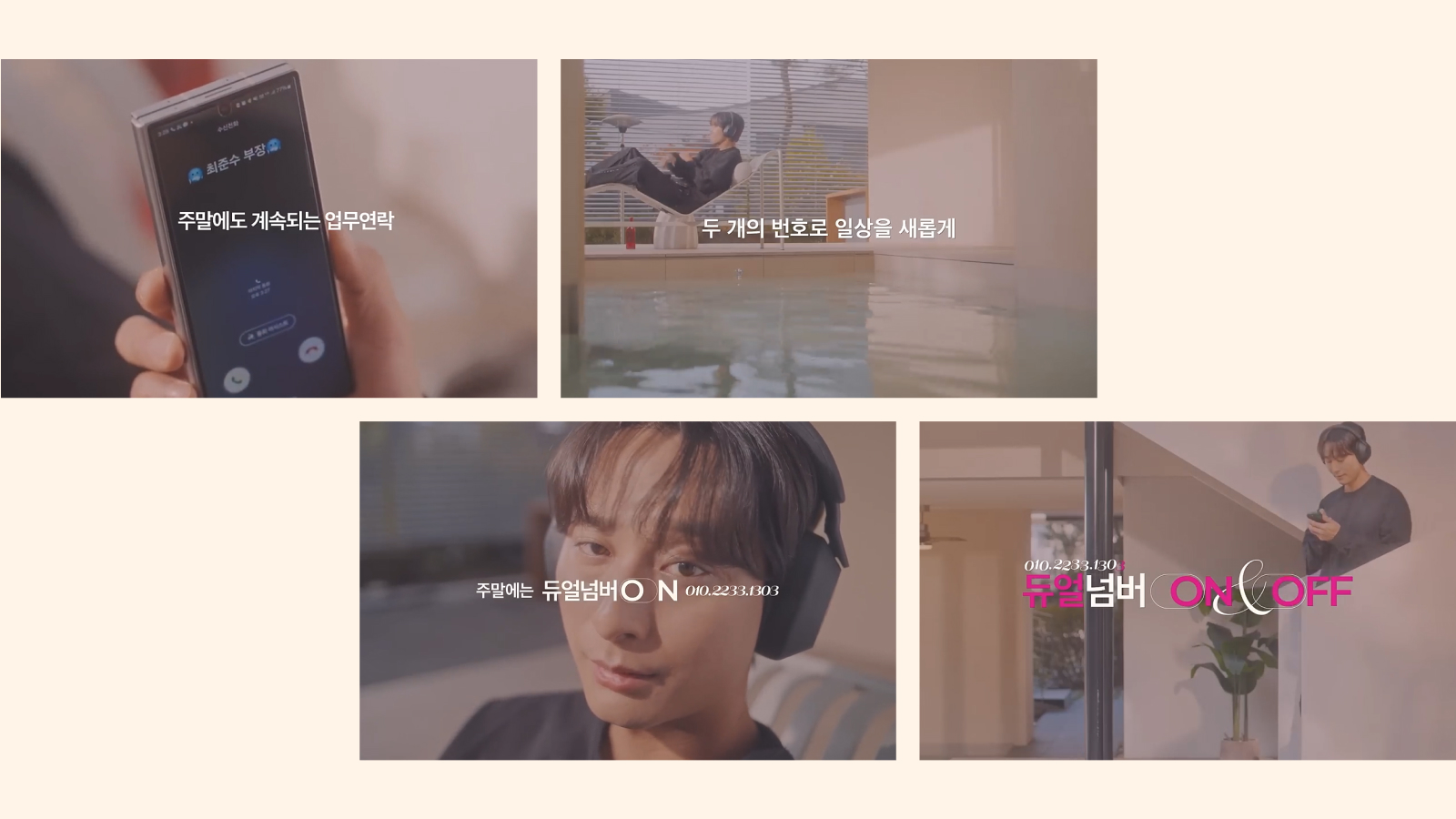 택배운송장의 개인정보를 걱정하는 송설희, 쉬고 싶은 주말, 상사의 업무연락을 받고 싶지 않은 남상원, 중고거래에서 상대방에게 전화번호 노출을 걱정하는 라은하를 통해 일상에서 비일비재한 듀얼넘버 온앤오프 서비스가 꼭 필요한 상황을 표현했습니다. ‘두 개의 번호로 일상을 새롭게’라는 카피로 새로운 서비스의 필요성을 심플하게 전달하고 ‘원할 땐 ON 필요할 땐 OFF 간편하게 분리하는 나의 소중한 사생활’이라는 엔딩 장면 카피로 네이밍과 서비스 핵심 속성을 한번 더 강조했습니다.