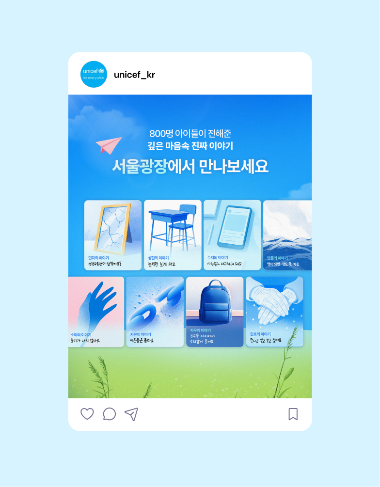 유니세프(UNICEF, 유엔아동기금)는 유엔 산하 기구로서 전 세계 어린이들을 위한 기금을 모금하고 보건, 영양, 식수·위생, 교육, 보호, 긴급 구호 등의 사업을 펼치고 있으며 한국에는 유니세프 한국위원회가 있습니다. 온더플래닛은 2025년 유니세프 마음건강 캠페인 <깊은 마음속 10.19Hz>을 총괄하며 청소년 마음속 깊은 곳의 진짜 이야기를 깊이 듣고 널리 나누었습니다.