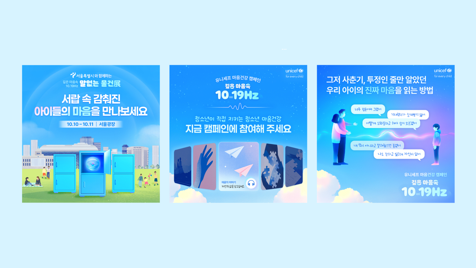 <깊은 마음속 10.19Hz> 캠페인은 학생들 800명의 실제 이야기가 바탕이 되었습니다. 온더플래닛은 캠페인의 독자적 슬로건과 키비주얼, 닫힌 물방울 속에서 요동치는 주파수를 형상화한 심벌 디자인을 개발하여 캠페인의 일관성을 구축했습니다. 하늘에서 심해로 이어지는 구성을 기획하고 아이들의 숨겨진 이야기를 심해로 표현한 웹페이지를 디자인 및 개발했고 청소년기를 상징하는 사물을 디자인 모티브로 하여 긴밀한 공감과 직관적 흥미를 유도했습니다.